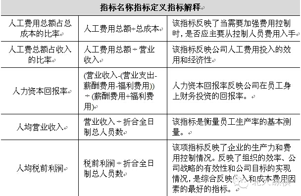在上表中,人工费用总额占总成本的比率、人工费总额占收入的比率是成本类指标,人均营业收入、人均营业收入是收入类指标,而人力资本回报率则是收入和成本的比率。