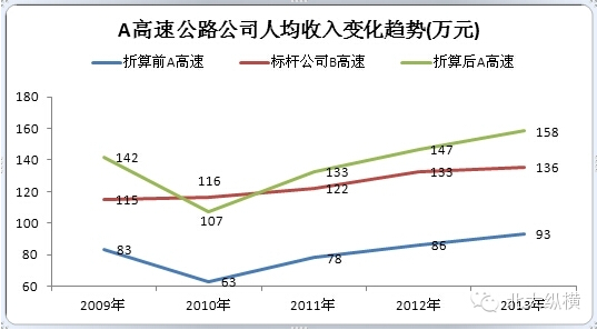 由于人均收入反映的是员工的生产率,因此,必须剔除环境因素才有比较的意义。在高速公路行业,可能影响收入的因素为高速公路所经过主要城市的经济活跃程度(GDP)、高速公路里程、每公里单价三个主要因素。因此,在对该公司进行分析时,首先把A高速公路公司和标杆公司B高速公路的经营环境进行折算,然后再进行比较。