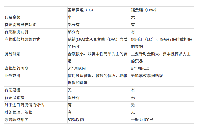 保理和福费廷这两种融资结算业务,在一定程度上帮助出口企业解决了资金上的融通问题。但是由于它们各自的特点不同,这两种融资方式有着贸易领域和融资期限的互补性,风险承担方式也各不相同。主要差异如下: