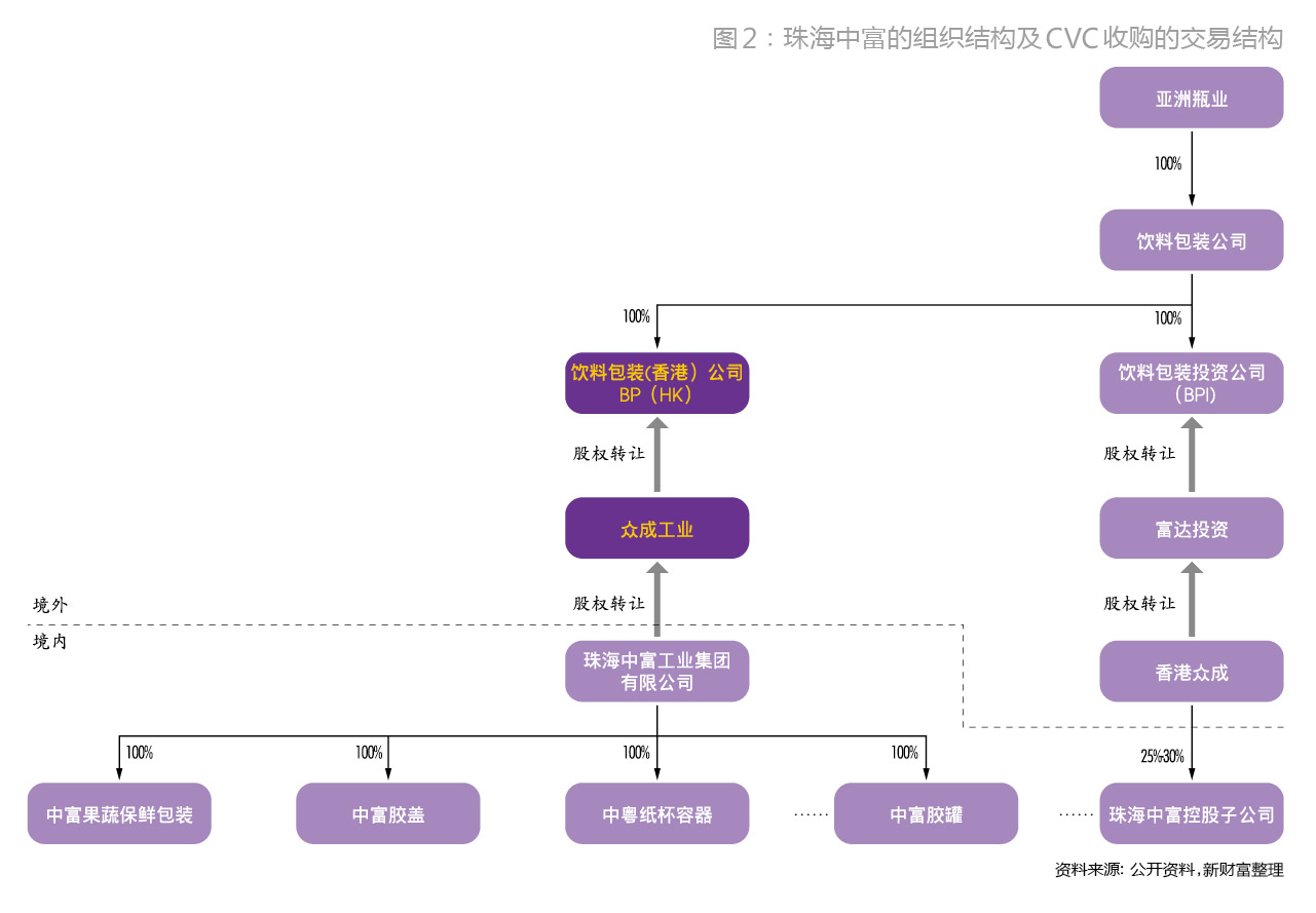 2007年3月,CVC通过旗下的亚太基金设立了多达4层的境外控制公司,最终由亚洲瓶业(香港)有限公司〔Asia Bottles(HK) Company Limited,简称“亚洲瓶业(香港)”〕从中富集团买入29%的股权,成为珠海中富实际控制人。