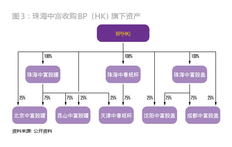 packing(HK) Company Limited,简称“BP(HK)”〕也100%收购了众成工业,从而控制了中富胶罐、中富胶盖、中粤纸杯容器等非上市关联企业。