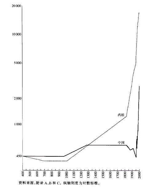 图:400年-1998年西欧与中国人均GDP比较,来源:麦迪森[1]