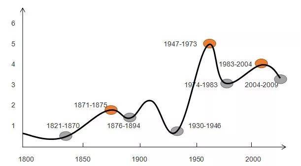 结合熊彼特周期和康波周期,我们将近代经济增长划分为以下几个周期: