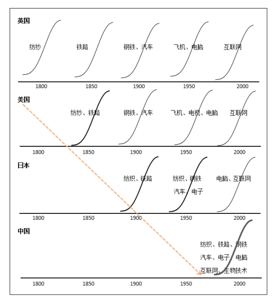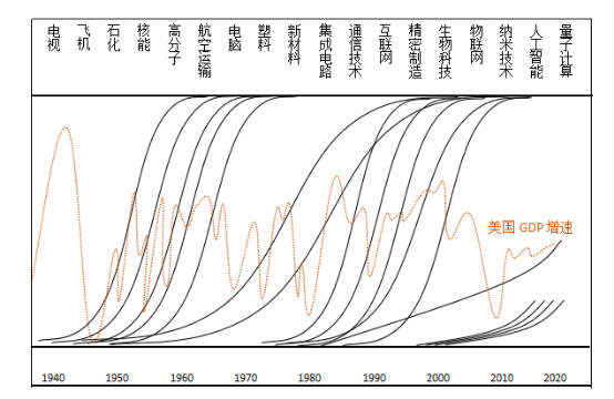 如此循环,一条条技术扩散曲线与经济增长曲线高度契合。