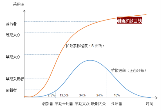 所以,罗杰斯根据创新的接受程度,将受众分为创新者、早期采用者、早期大众、晚期大众和落后者五大类,他们分别对应的采用率为2.5%、13.5%、34%、34%、16%,呈现正态分布。