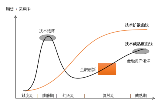 当时技术处于早期大众接受期时,技术大规模应用到产业领域,经济出现规模效应。这时,技术扩散吸引资金进入实体经济,刺激金融创新。历史上,每当经济进入景气周期,技术扩散都刺激大量的金融创新[6]。